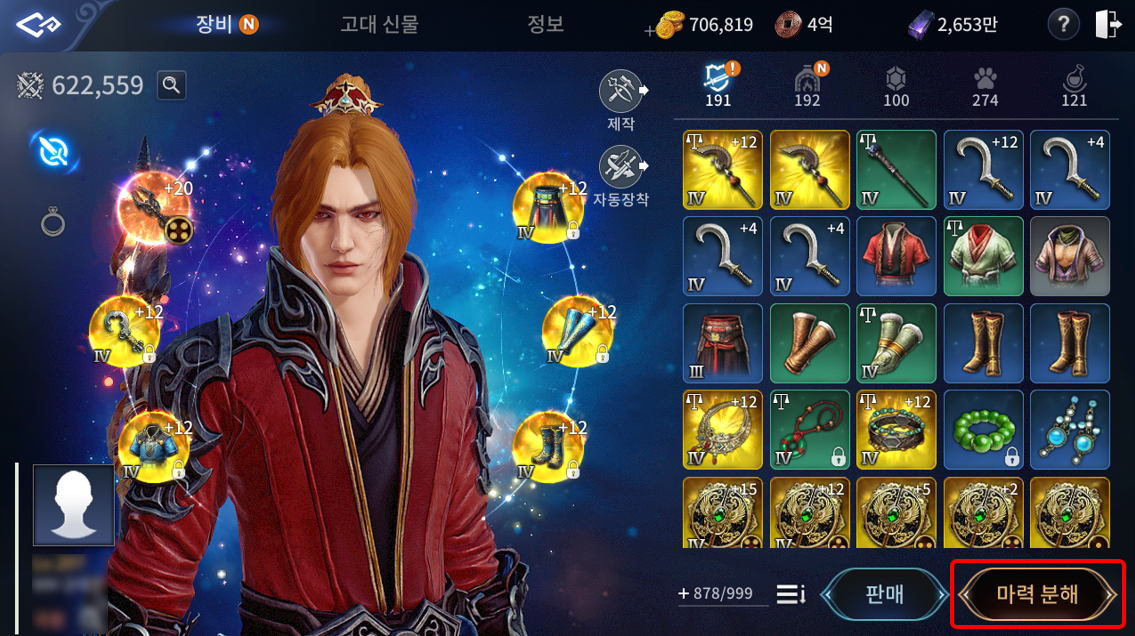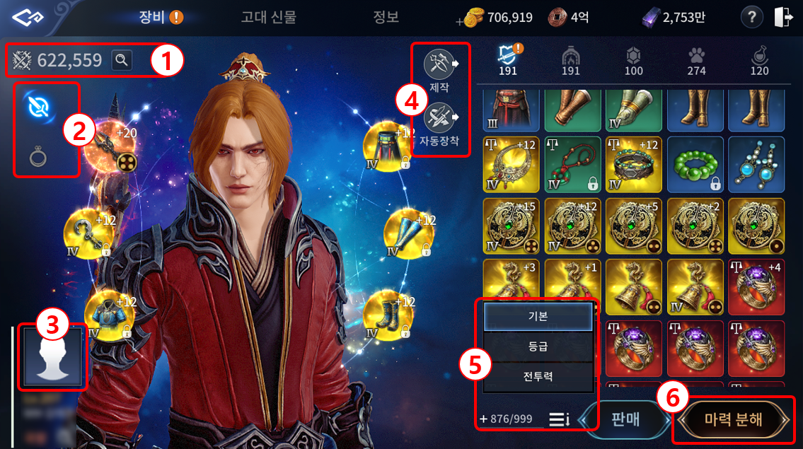 장비 - 화면 우측 상단의 장비 아이콘을 터치하거나 메뉴의 캐릭터 > 장비 탭을 터치하여 장비 창으로 이동할 수 있습니다. ① 장비 창에서 캐릭터의 전투력과 프로필, 장착된 장비, 가방을 확인할 수 있습니다. - 돋보기(🔍︎) 버튼을 클릭하면 캐릭터의 상세 능력치를 확인할 수 있습니다. ② 캐릭터가 장착 중인 장비를 확인할 수 있습니다. - 첫 번째 페이지에서는 무기, 보조무기, 방어구 4종의 장착 정보를 확인할 수 있습니다. - 두 번째 페이지에서는 장신구 6종의 장착 정보를 확인할 수 있습니다. ③ 화면 좌측 프로필 사진을 터치 후 사진 추가 버튼을 이용하여 캐릭터의 프로필 사진을 변경할 수 있습니다. ④ 화면 중앙의 버튼을 통해 제작공방으로 이동하거나 전투력이 가장 높은 장비를 자동으로 장착할 수 있습니다. ⑤ 화면 중앙 하단에서 가방의 공간을 확장하거나 아이템 목록의 정렬 기준을 변경할 수 있습니다. ⑥ 화면 우측 버튼을 통해 사용하지 않는 아이템을 판매하거나 마력 분해를 진행할 수 있습니다. ⑧ 아이템을 터치한 후 아이템 정보 창에서 획득 경로와 거래/판매 가능 여부를 확인할 수 있습니다. ⑨ 거래가 가능한 아이템은 거래소 버튼을 터치해 해당 아이템의 매물을 확인할 수 있습니다. ⑩ 판매 버튼을 터치하여 설정한 필터에 맞는 아이템을 자동 선택할 수 있습니다. ⑪ 아이템 다중 판매 시 한 번에 최대 24개까지 선택 가능합니다. 정보 캐릭터 > 장비 창에서 상단 정보 탭을 터치하여 정보 창으로 이동할 수 있습니다. ① 캐릭터의 전투력을 확인할 수 있으며, 돋보기(🔍︎) 버튼을 통해 세부 내용을 확인할 수 있습니다. ② 캐릭터 기본 호칭/전투력/성향 등급/문파/스킬/정령/수련/랭킹 정보를 확인할 수 있습니다. ③ 제작 버튼을 통해 제작공방으로 이동할 수 있습니다. 호칭 시스템 - 비표시 상태/관직표시상태/호칭표시 상태 총 3가지로 나눌 수 있습니다. - 호칭 : 호패를 사용하여 7일간 원하는 호칭을 표시할 수 있습니다. 호칭 변경 시 사용 중인 호칭은 사라지며, 호칭 사용 기간은 7일로 초기화됩니다. - 관직 : 국왕에게 관직을 하사받은 경우 호칭을 대신하여 사용할 수 있습니다. 관직을 보유중인 경우에는 호칭을 숨길 수 없습니다. 마석 메뉴의 캐릭터 - 마석 탭을 터치하거나, 장비 창에서 좌측 상단 마석 탭을 터치하여 마석 창으로 이동할 수 있습니다. ① 좌측의 장착정보를 통해 마석으로 적용된 능력치의 정보를 확인할 수 있습니다. ② 보유중인 마석을 장착하거나 해제할 수 있습니다. ③ 마석 합성 버튼을 터치하여 제작공방 > 합성으로 이동할 수 있습니다. 홍예석 홍예석은 기존의 동급 마석보다 능력치 수치가 1.5배 높은 마석으로, 메뉴의 캐릭터 - 마석 탭을 통해 이동할 수 있습니다. ① 고정된 옵션은 없으며, 랜덤 옵션이 최대 6개까지 적용됩니다. ② 마석 팔레트 중앙에 홍예석 전용 슬롯이 존재하며, 3개의 홍예석을 장착할 수 있습니다. ⓐ 동일한 등급의 홍예석 총 4개를 사용하여 합성을 진행할 수 있습니다. ⓑ 초월은 전설 등급 이상 동일 등급의 홍예석과 흑철, 동전을 소모하여 진행할 수 있습니다. (※ 초월은 최대 5단계까지 가능하며, 1초월 시도 시부터 실패 확률이 적용됩니다.) ③ 홍예석 전용 슬롯은 위업 → 무혼의 탑 12단계 달성 시 오픈됩니다. 의상 - 메뉴의 캐릭터 - 의상 탭을 터치하여 의상 창으로 이동할 수 있습니다. ② 의상 장비를 터치해 의상을 미리보기할 수 있습니다. ③ 의상 장비 목록 하단의 화살표 버튼을 터치해 미리보기를 초기화할 수 있습니다. ④ 구매한 장비를 터치해 의상 장비를 염색하거나 착용, 해제할 수 있습니다. ⑥ 화면 좌측에서 착용한 의상 장비를 확인하고 외형을 보이게 하거나 보이지 않게 할 수 있습니다. 탑승 - 메뉴의 캐릭터 - 탑승 탭을 터치하거나, 의상 창에서 좌측 상단 탑승 탭을 터치하여 탑승 창으로 이동할 수 있습니다. ② 탑승물 구매 시 획득 가능한 능력치를 확인할 수 있습니다. ③ 탑승물을 구입하거나 탑승을 설정, 해제할 수 있습니다. (※탑승 설정 시 필드에서 설정된 탑승물을 이용하여 이동하게 됩니다.) 마력 분해 - 장비의 화면 우측 하단에서 [마력 분해] 버튼을 클릭하면 마력 분해 화면으로 이동하실 수 있습니다. ① 화면 우측에서 마력 분해에 사용할 장비를 선택하실 수 있습니다. - 마력 분해는 희귀/영웅 등급의 장비로 이용하실 수 있습니다. ② 화면 좌측에서 등록된 장비와 마력 분해 단계를 확인하실 수 있습니다. - 마력 분해 단계는 고급/희귀/영웅 1~6단계로 구성되어 있습니다. - 등록된 장비의 등급/티어/강화 수치가 높을수록 더욱 높은 단계의 보상을 획득하실 수 있습니다. ③ 마력 분해 시 하단에 출력되는 리스트에서 하나의 아이템을 획득하실 수 있습니다. ※ 마력 분해의 등급별 결과 아이템 확률은 [미르4 마력 분해 확률 정보]를 참고해 주시기 바랍니다. ④ [자동 등록]과 [초기화] 버튼을 통해 장비를 자동으로 등록하거나 등록 리스트를 초기화 할 수 있습니다. - 등록 필터를 통해 [자동 등록] 버튼의 설정을 변경하실 수 있습니다. 웨어러블 - 게임 내 메뉴 > 캐릭터 > 웨어러블 