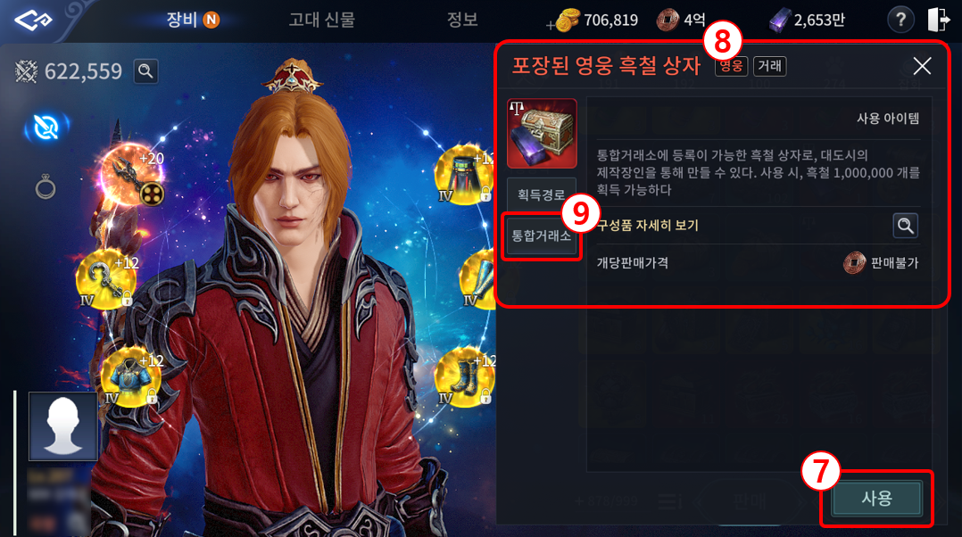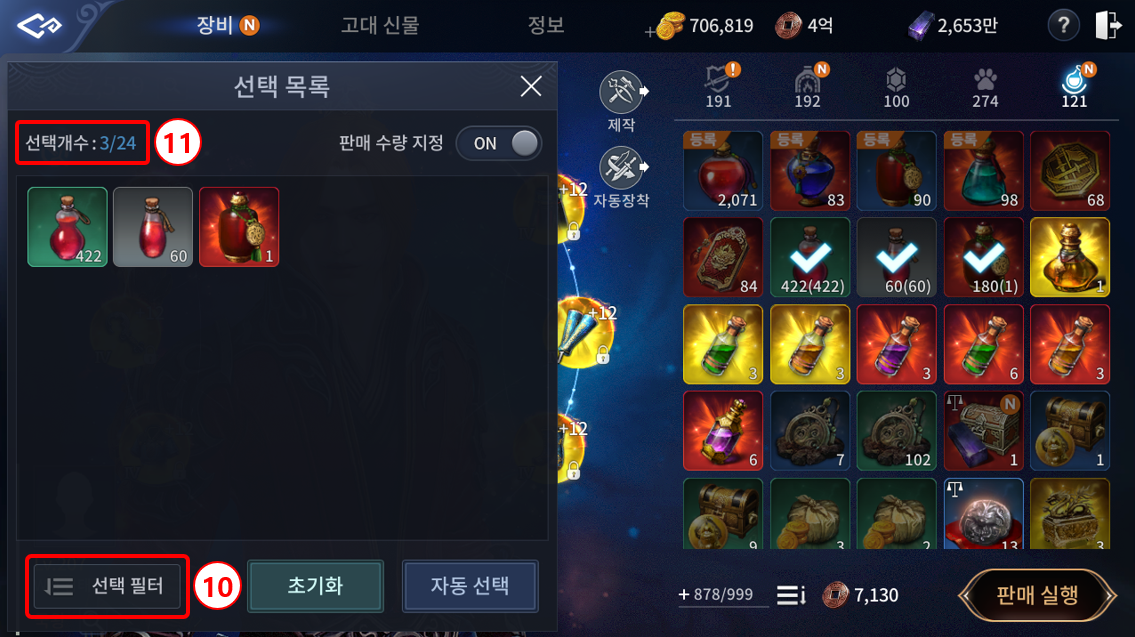 ⑦ 가방에 보관된 아이템을 터치하여 판매하거나 사용할 수 있습니다.