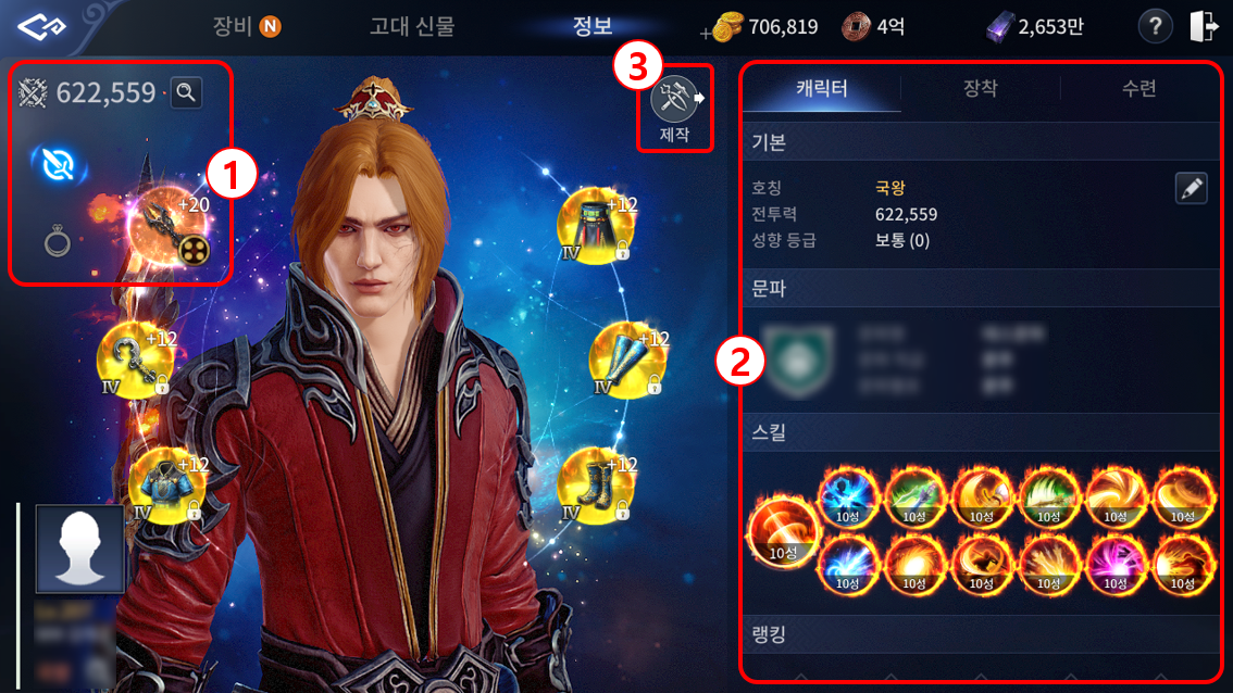 캐릭터 메뉴에서는 보유 중인 아이템을 관리하거나 캐릭터의 상세 정보를 확인할 수 있습니다. 또한 제작장비/마석/보패/용신기/전승장비/외형장비 등 각종 장비 아이템의 장착 상태를 변경할 수 있습니다.