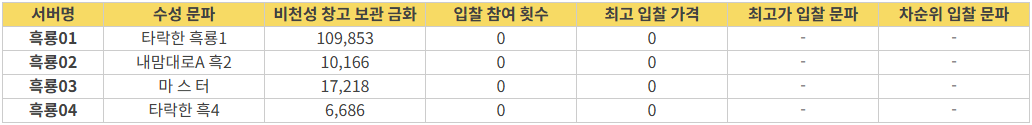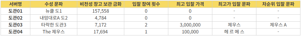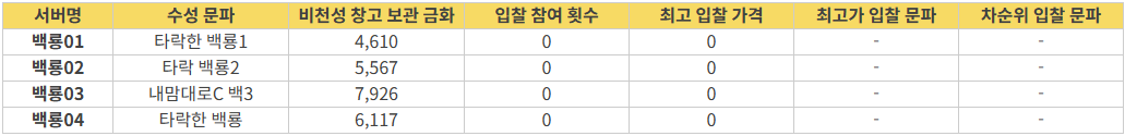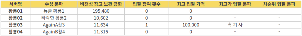※ 서버별 예상 수입 금액(비곡/거래소)은 점령 후 실제 획득되는 수입과 다소 차이가 있을 수 있음을 참고해 주시기 바랍니다.